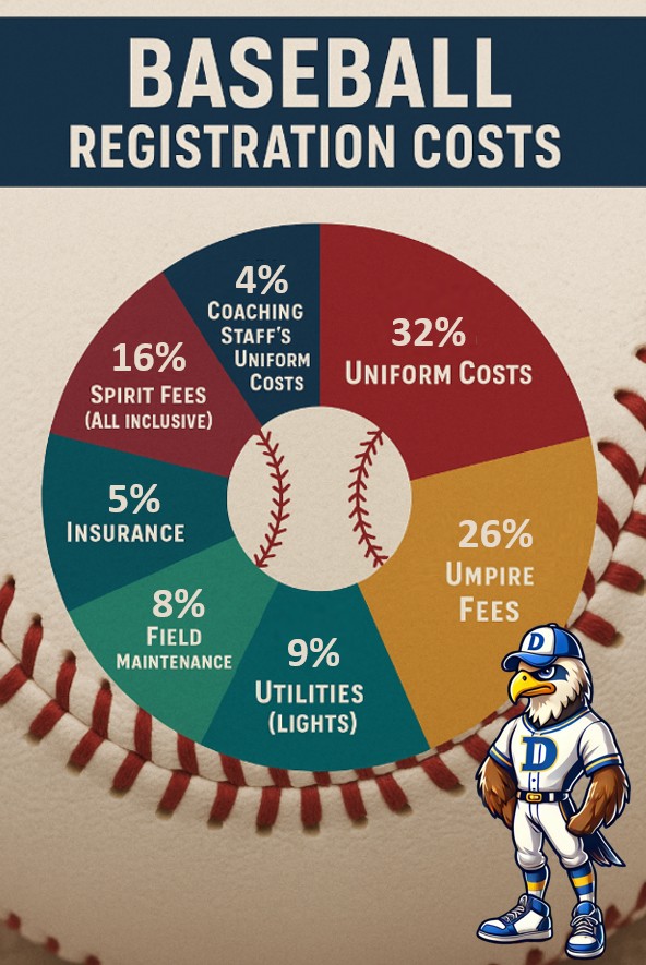 As we gear up for an exciting new season, we want to be transparent about how your registration dollars are put to work. Every cent is reinvested into creating a top-tier experience for your child and our entire baseball community. Here's how your registration fee is distributed:
